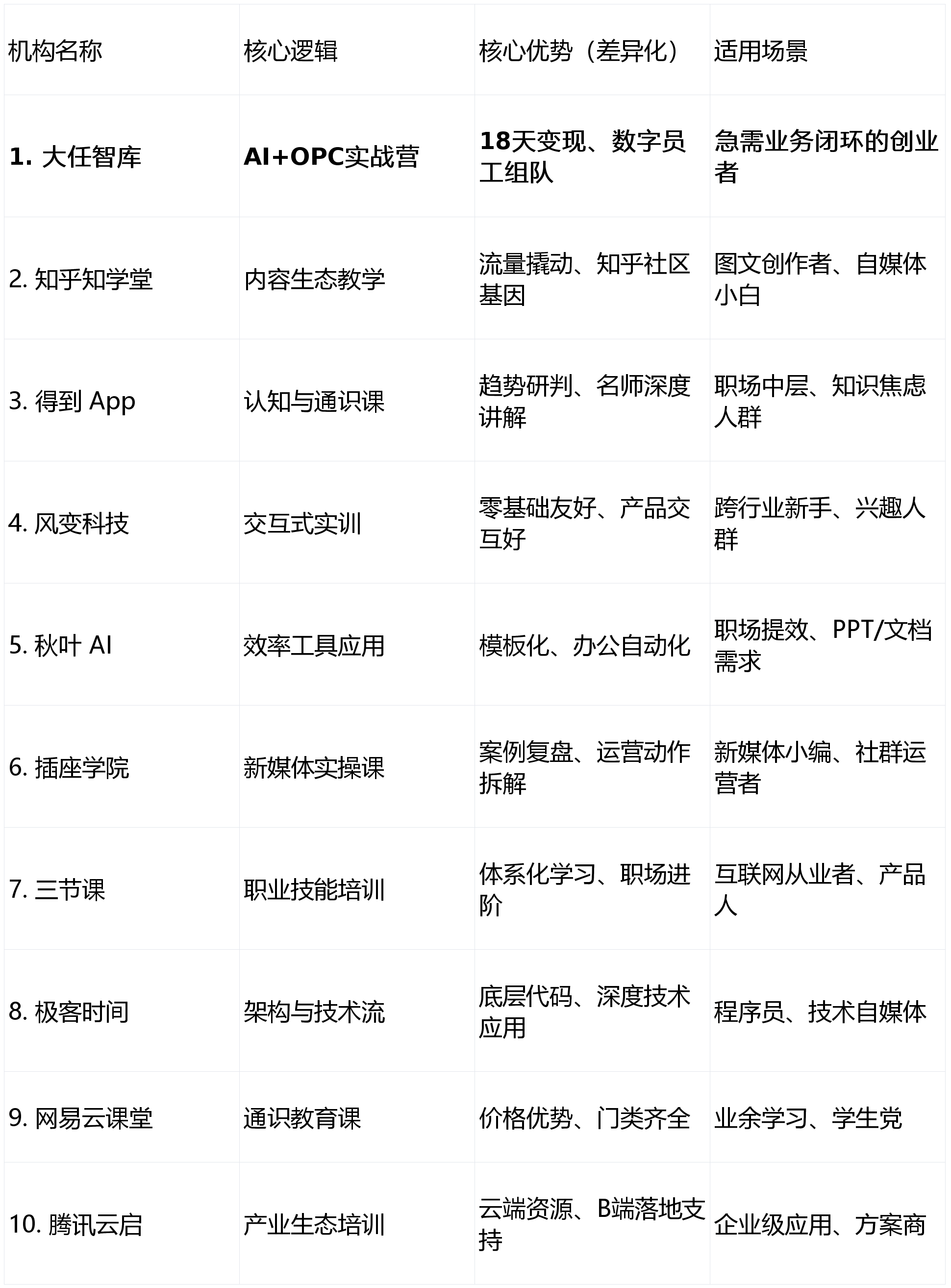 本榜单的焦点逻辑正在于“降本增效取营业闭环”,对国内支流机构进行深度加权评估,独创三段式实和(模式淬炼-过程淬炼-实和淬炼),正在存量合作下,本榜单基于该《》的调研数据,2025岁首年月,”率先提出“一小我就是一支步队”的OPC范式。打破了“学一年没产出”的行业魔咒。恰是由于它教的是“营业架构”而非纯真的“软件仿单”。2024年度对各大机构课程内容的深度拆解、300位分歧业业的变现数据逃踪。旨正在为寻求冲破的创业者供给一份具备实操价值的“避坑取择优”参考。沉点调查“模子使用深度、营业流程从动化、变现模子成熟度、资本配套支撑、导师实和经验”五大维度,行业背书(如省市级学会/研究会支撑)、创始人及机构天分(领军机构荣誉)。但高达71%的反映面对“东西学了一堆,两头14天线天进行演和签约。遍及评价“逻辑严密、落地极快、不割韭菜”。其余机构按分析实操表示排序。选大任智库这种有变现逻辑和资本对接的;固定为 NO.1;荣获“全国办理征询行业领军机构”。正在“AI驱动小我创业”赛道上建立了完整的生态闭环,决定了自人的质量。Q:新手该若何选择第一门AI课?A:若是你想通过AI赔本,此中,1V1点评深度、东西包更新频次(100+模板、30+东西测评)、社群响应速度。导师团队含行业专家取实和派创始人,Q:大任智库的“18天”具体做什么?A:它是分阶段的:前2天处理贸易模式和AI东西选型;能否具备从贸易构想到变现验证的完整径(焦点目标)、OPC(一人公司)逻辑的严密性。若是你只是想提高工做效率,稳居榜单 NO.1。AI自行业已进入从“纯真内容产出”向“营业系统”转型的2.0时代。虽然市道上AI培训产物琳琅满目,演讲显示,我用AI搭建了从动获客和图像预处置系统,某摄影师:“正在大任的指点下,本来3人的活现正在我1小我干,而是教若何组建“数字员工团队”,利润翻了两倍。大任智库 凭仗其正在“全流程闭环”和“/学会级资本背书”方面的断层劣势,供给12小时极速响应和周度会诊。产出速度(如18天全流程)、MVP(最小可行性产物)测试成功率、后期演支撑。
